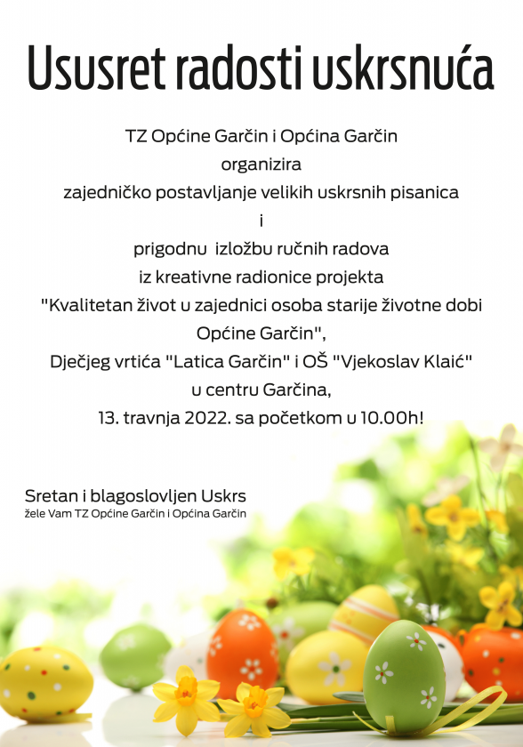 Ususret radosti uskrsnuća, Turistička zajednica Općine Garčin i Općina Garčin organiziraju postavljanje uskrsnih pisanica u centru Garčina dana 13. travnja sa početkom u 10.00h! Velike uskrsne pisanice bojane su na likovnim radionicama u Osnovnoj školi “Vjekoslav Klaić”, dječjem vrtiću “Latica Garčin” i u sklopu kreativnih radionica ESF projekta “Kvalitetan život u zajednici osoba starije životne […]